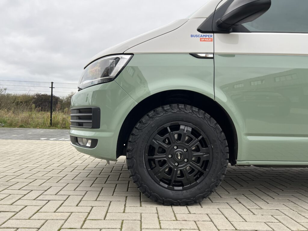 Boas koos voor een buscamper met gave offroad banden met een breed profiel, dit geeft de buscamper gelijk een stoer aanzicht.