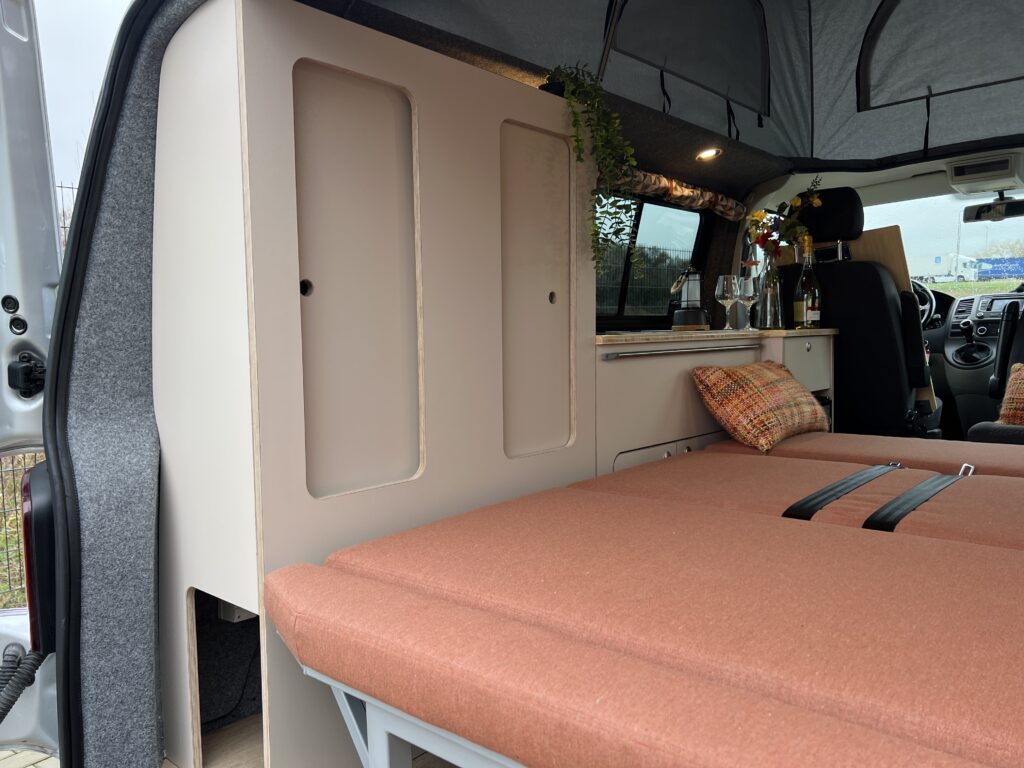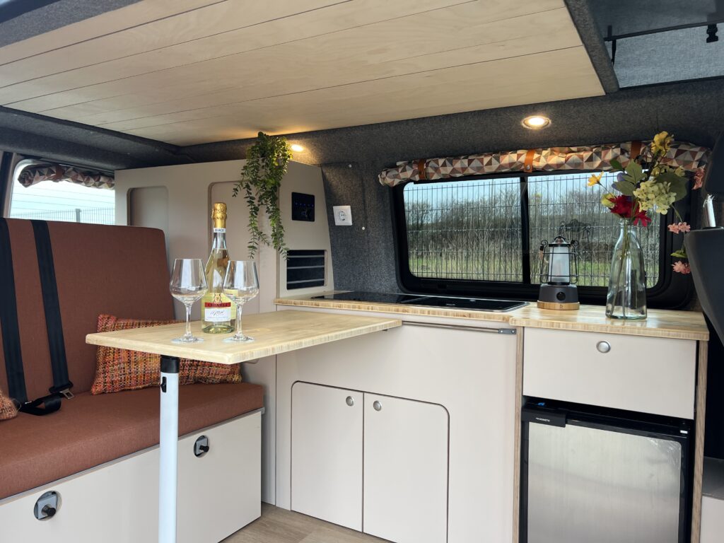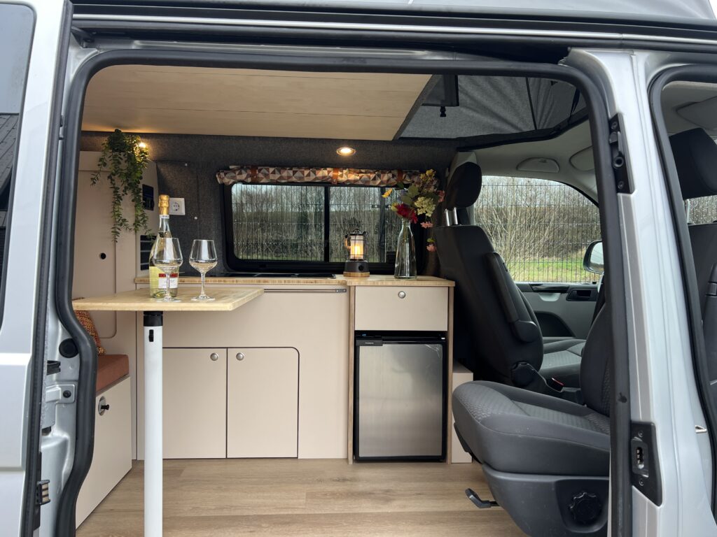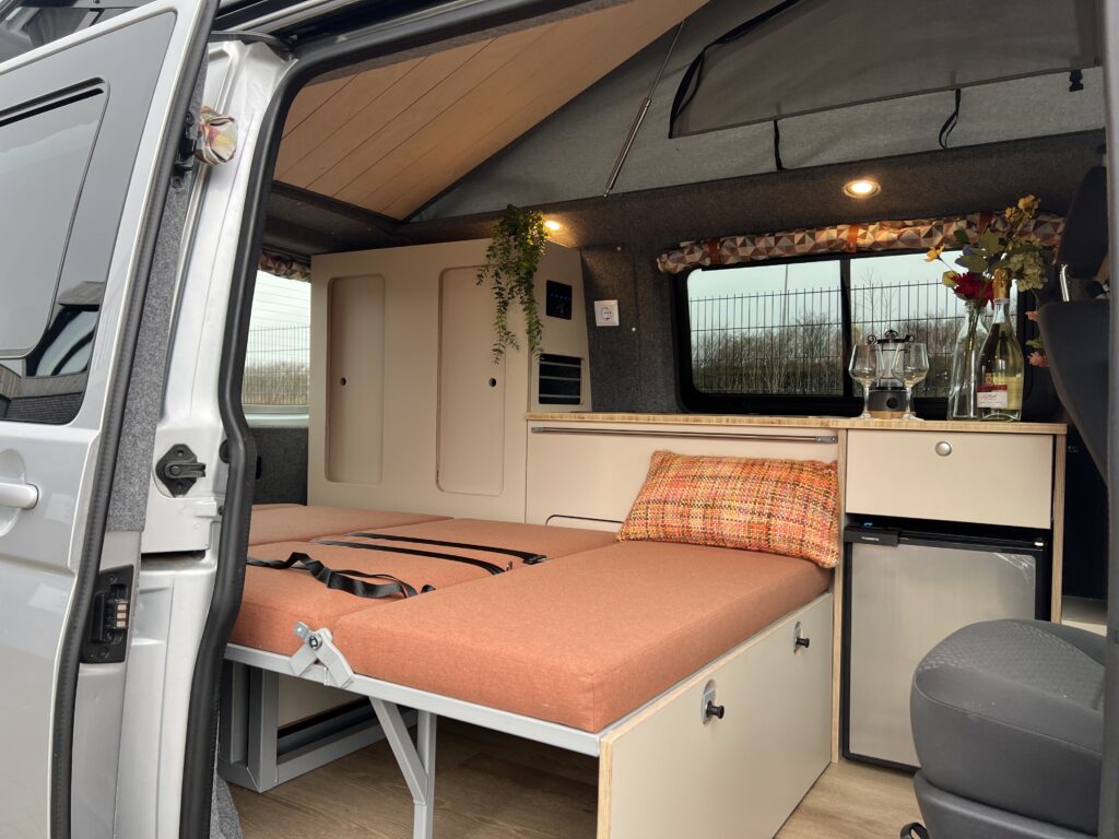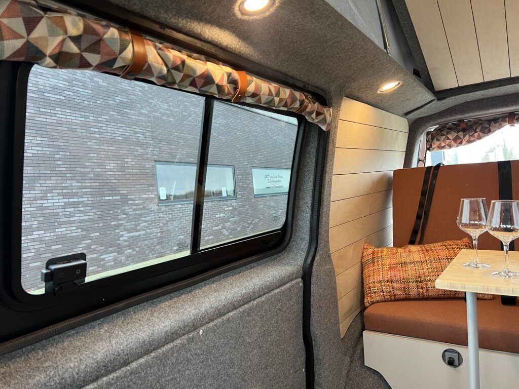 Dolblij was Hester toen ze haar Florida buscamper bij ons kwam ophalen, wat een transformatie! Het hefdak met grijs doek heeft een eigentijdse uitstraling en geeft in de buscamper een ruimtelijk gevoel.