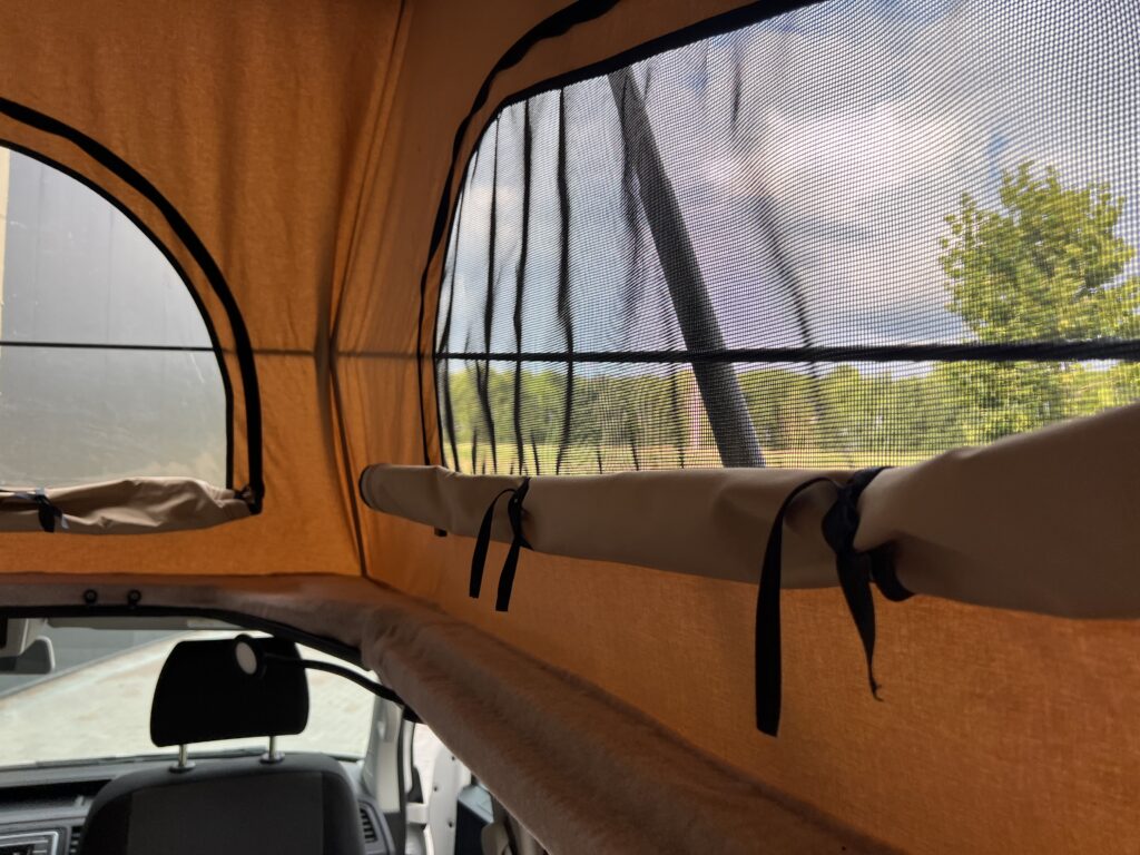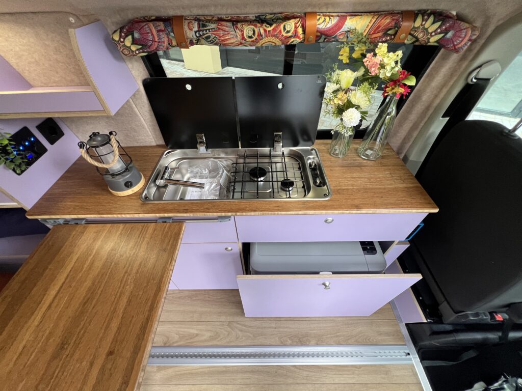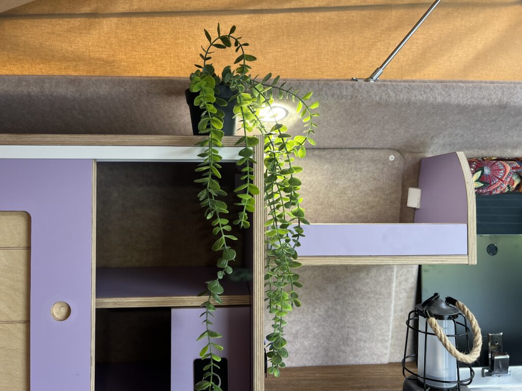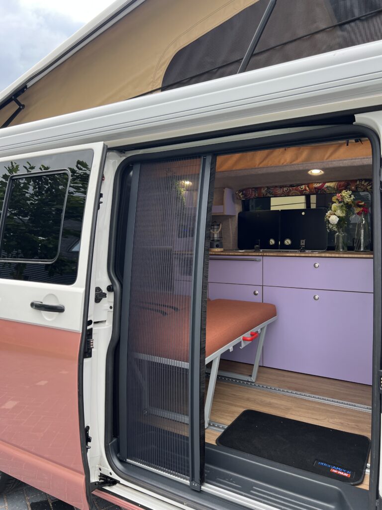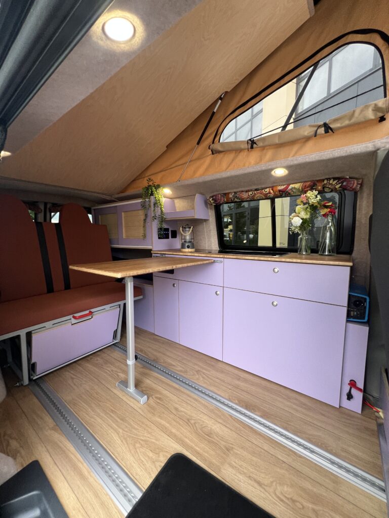 Ondanks het compacte formaat biedt deze bus alles wat nodig is: een hefdak met slaapruimte, een praktische keuken en voldoende opbergruimte voor drie personen. Alles is doordacht ingericht zodat reizen eenvoudig en comfortabel blijft — ook met een kind aan boord.