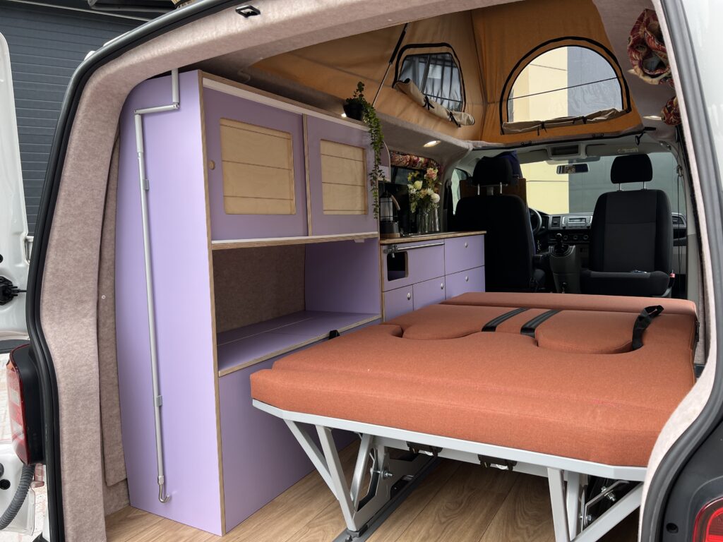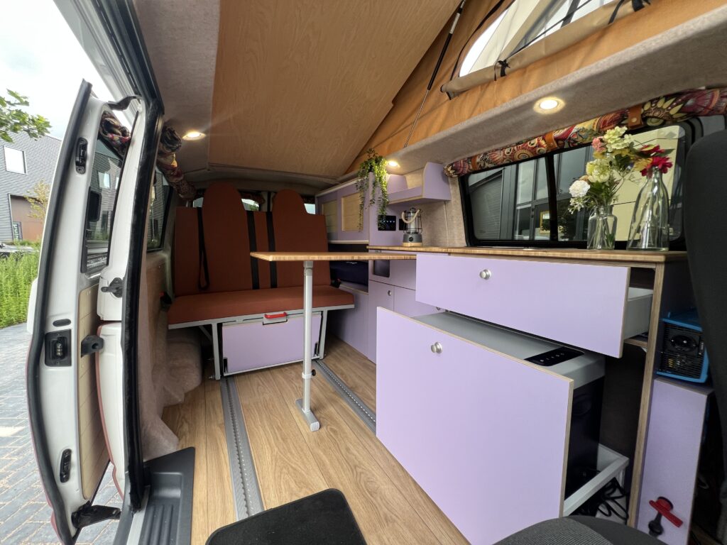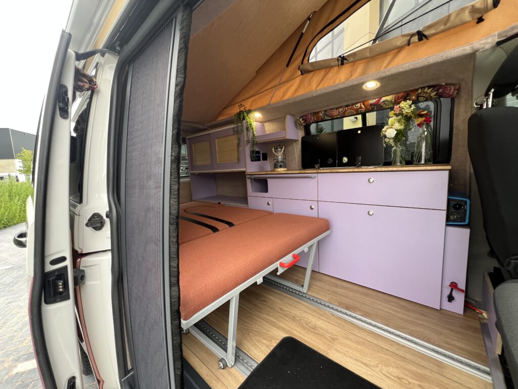 De basis van deze camper is een Volkswagen Transporter L2, uitgevoerd als Florida op rails. Het interieur sluit perfect aan bij het speelse exterieur: paars tinten, lichte houtaccenten en een open, frisse indeling. Dankzij het railsysteem kan de achterbank verschoven worden, waardoor de bus even goed dienst doet als gezinsauto als voor weekendtrips en vakanties.