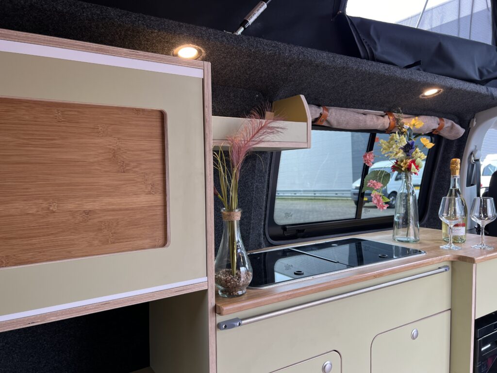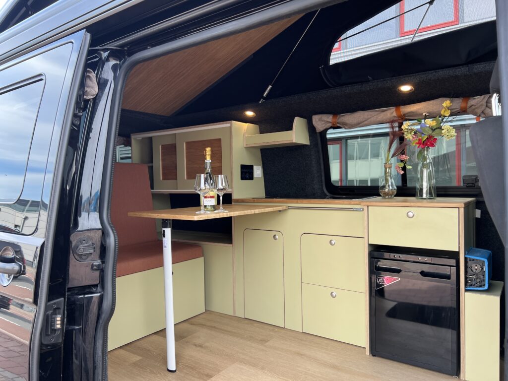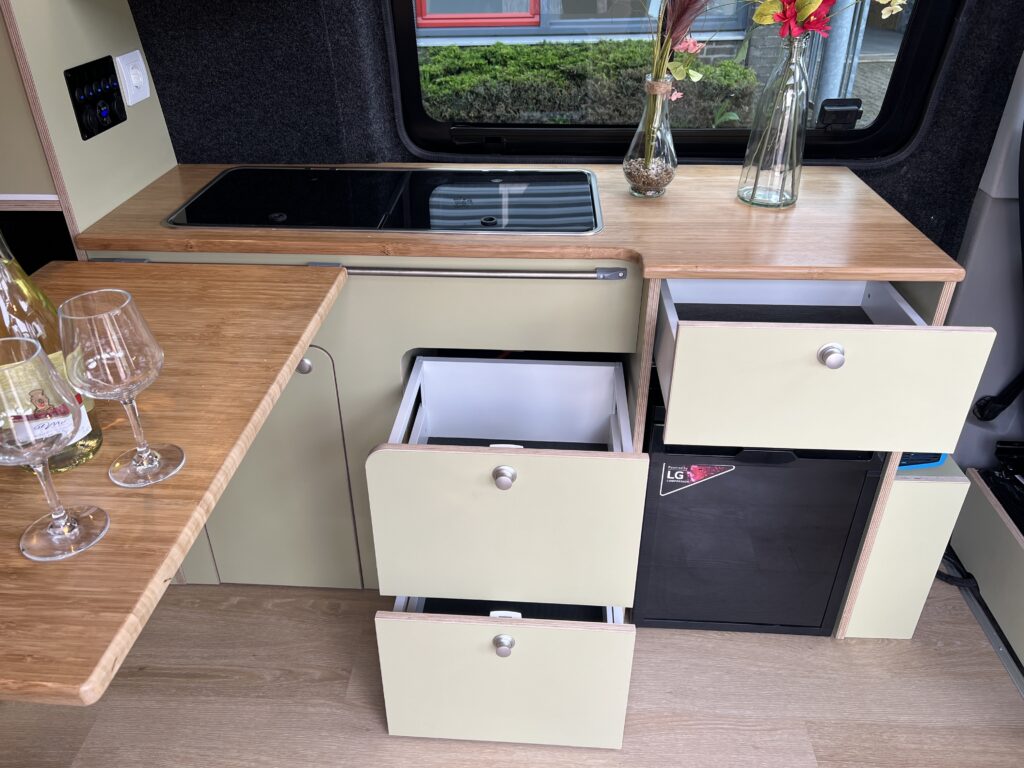 De keuken is passend gemaakt in de lengte, zodat er ook voldoende ruimte is om de bestuurdersstoel bij te draaien. Zo ontstaat er een extra ruime zithoek.